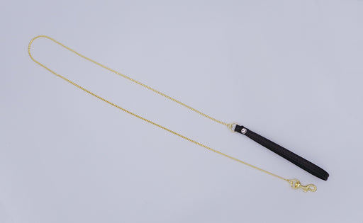 Exclusieve goudkleurige leash met een fijn patroon van slangenhuid. Subtiel en opwindend bijzonder. De handlus is stevig leer.Totale lengte ca. 120 cmKetting...